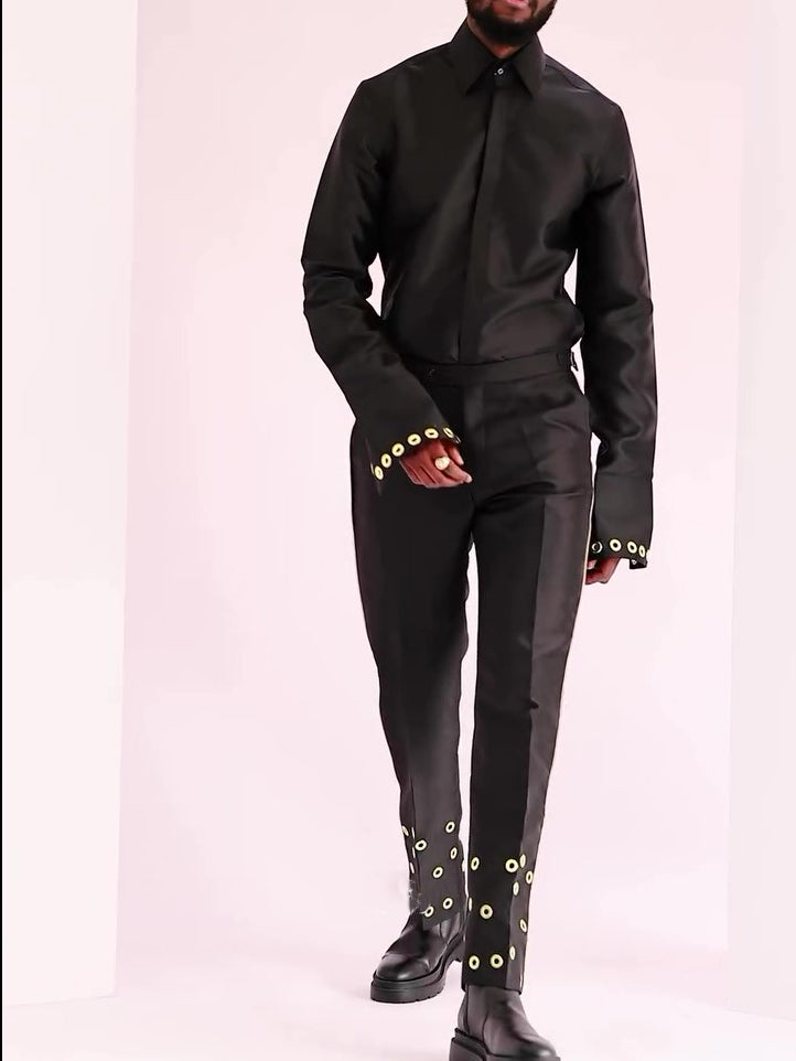 Chic Black Formal Ensemble With Adjustable Eyelet Trim And Structured Silhouette